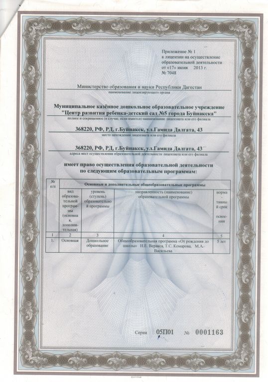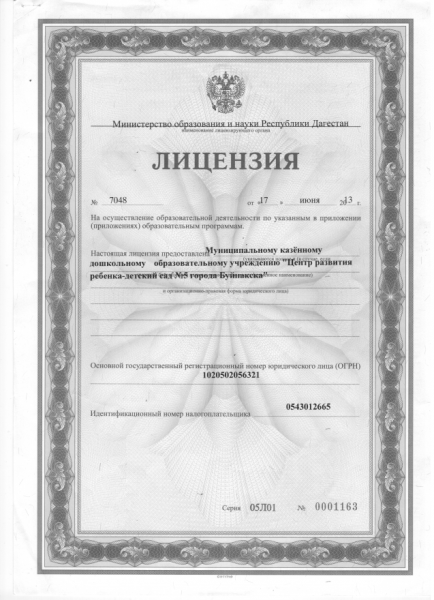 Полное наименование образовательной организации* Муниципальное казенное дошкольное образовательное учреждение "Центр развития ребенка - детский сад №5 города Буйнакска"